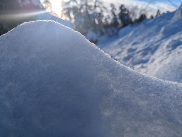 Что мы и наблюдаем. После сильных снегопадов пришёл мороз до - 30 и солнечная погода. В солнечную погоду можно полюбоваться сугробами и искрящимися на них кристаллами льда во всей красе.