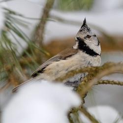 Хохлатая синица (гренадёрка) — её отличает острый хохолок на голове (фотография 3, автор Сергей Неклюдов).